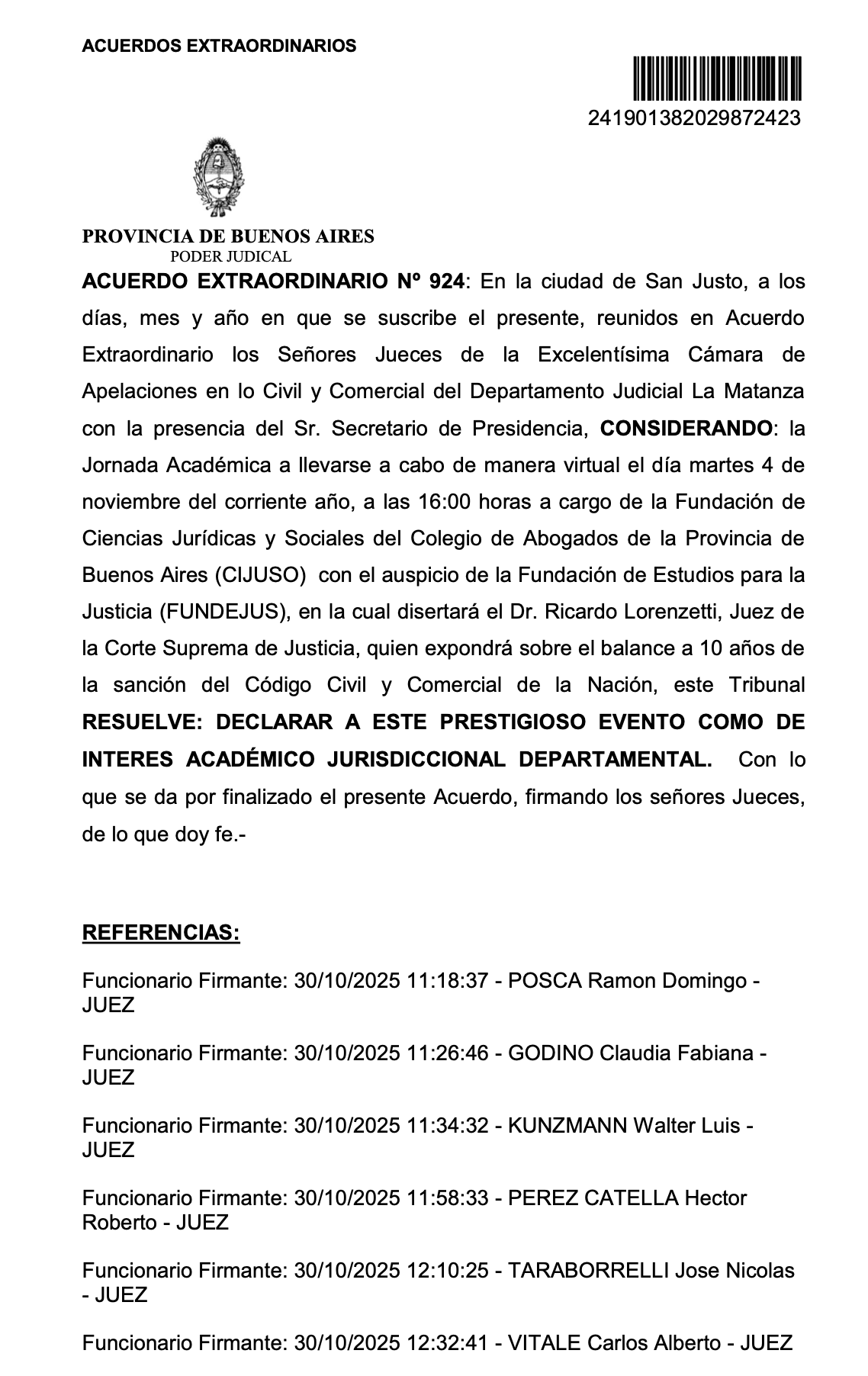La Procuración General de la Suprema Corte de Justicia de la Provincia de Buenos Aires, a cargo del Dr. Julio Conte Grand, declaró de interés institucional la Conferencia Magistral del Dr. Ricardo Luis Lorenzetti, titulada “Balance a 10 años de la sanción del Código Civil y Comercial”, que se llevará a cabo el martes 4 de noviembre, de manera virtual.